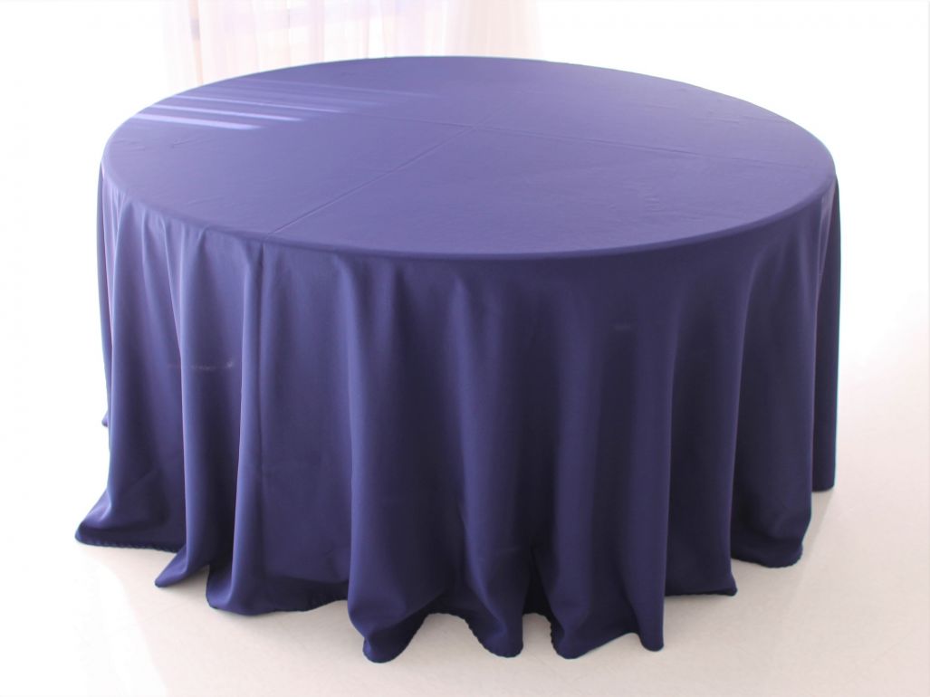 This navy blue 120-inch diameter round tablecloth will reach to the floor on a 60-inch round table.