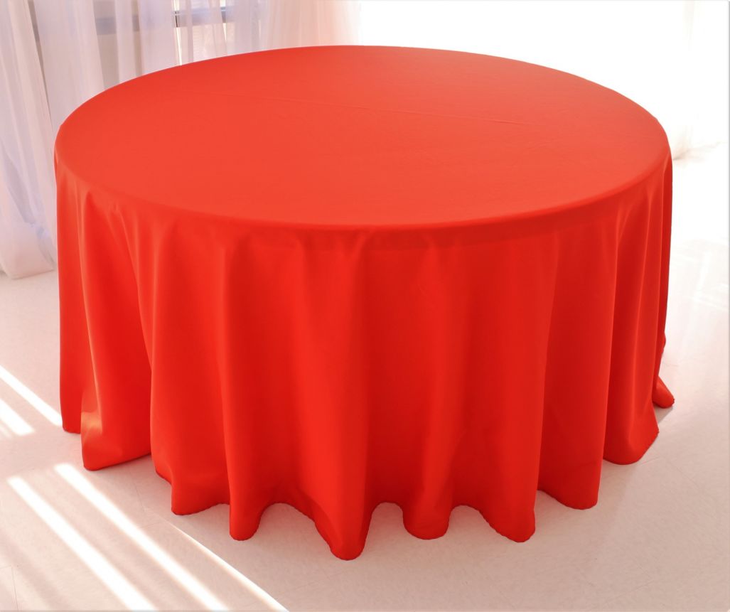 Bright red 120-inch diameter poly tablecloth. Fits to the floor on a 60' round table.