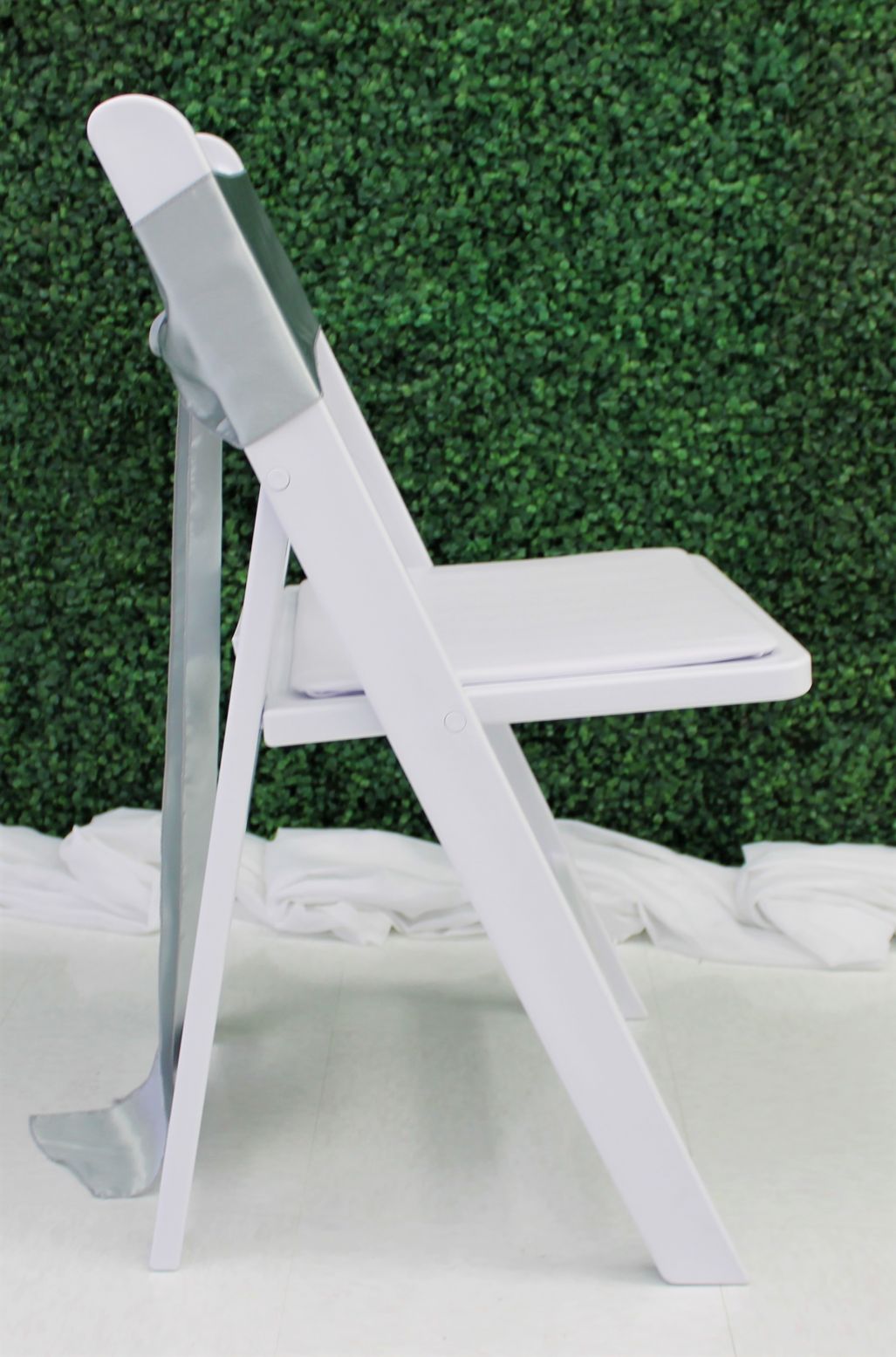 Sleek, shiny silver chair sash