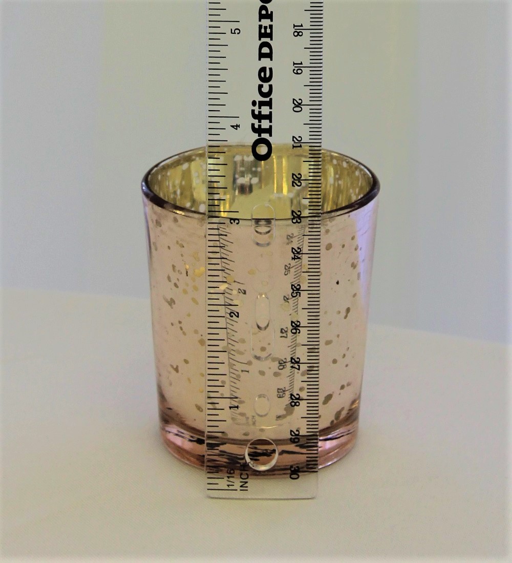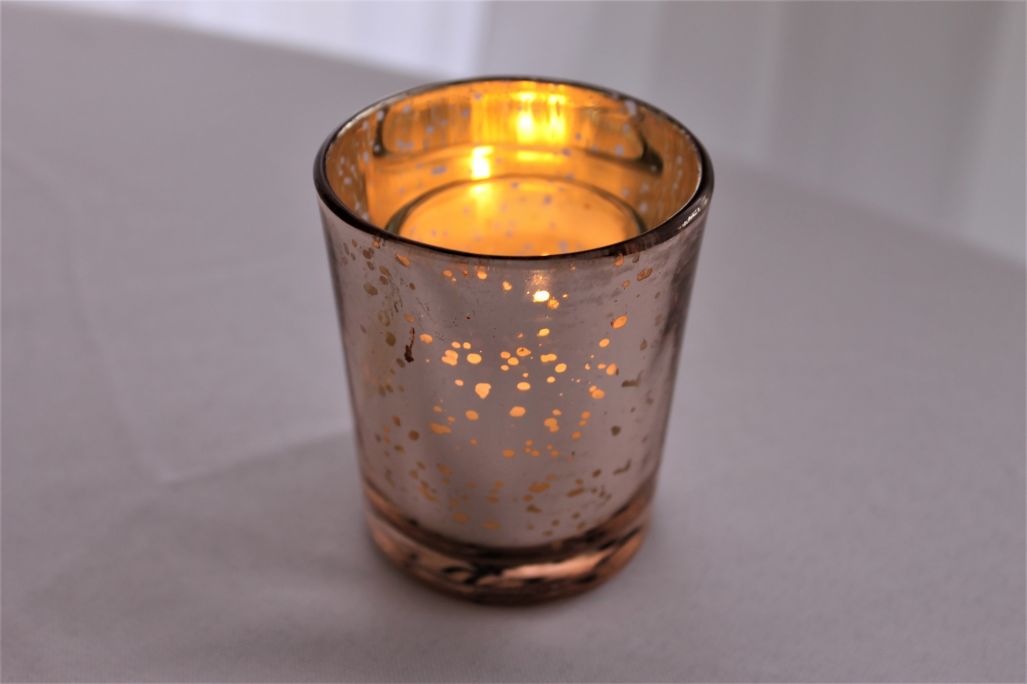 Tie your tabletop look together with our rose gold mercury glass votive candle holder