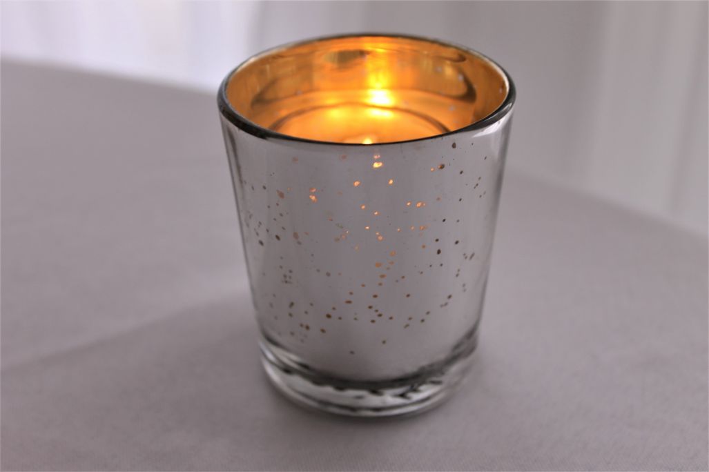 Carry your silver accents throughout your Big Day with our silver mercury glass votive candle holder.